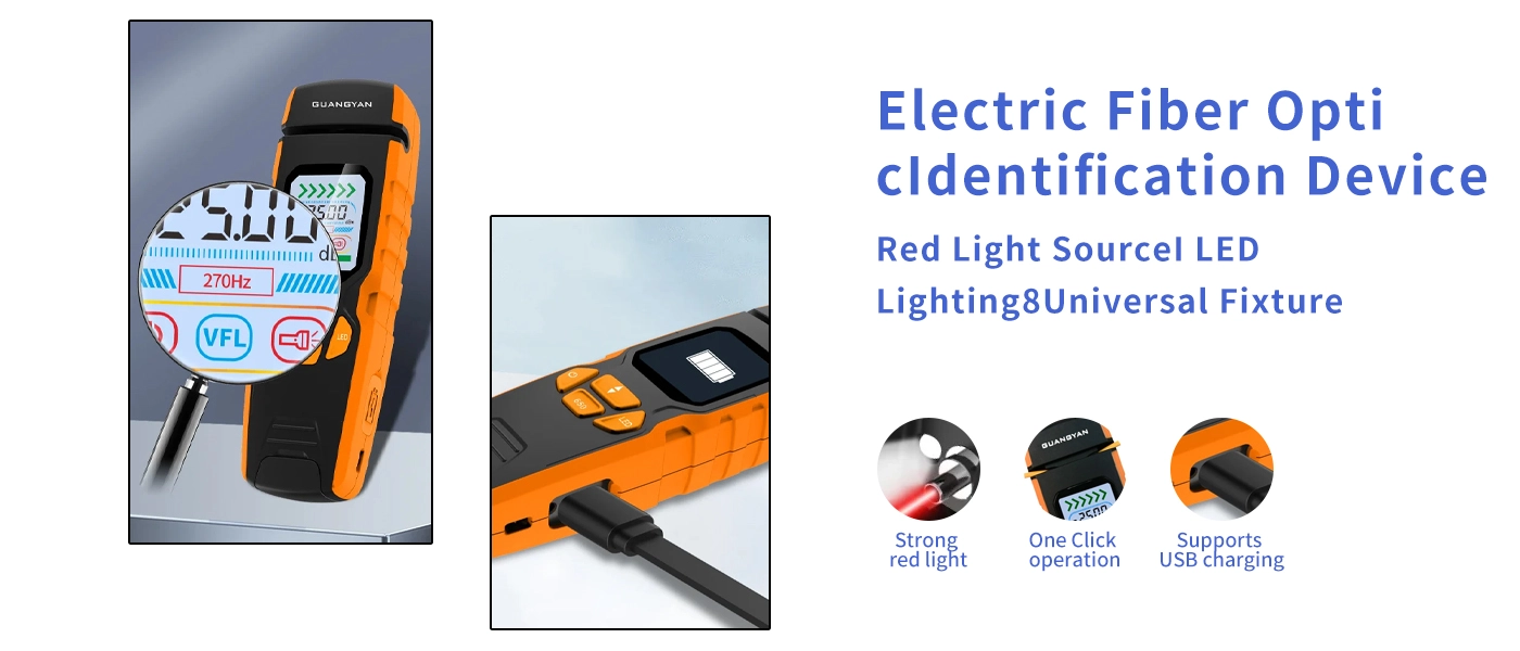 This electric fiber optic identification device integrates hidden red light source, high-brightness LED, and micro-bending testing technology. Designed for quick on-site fiber identification and signal frequency detection, it supports one-click operation, multiple charging methods, and universal cable compatibility, making it ideal for professional fieldwork.
