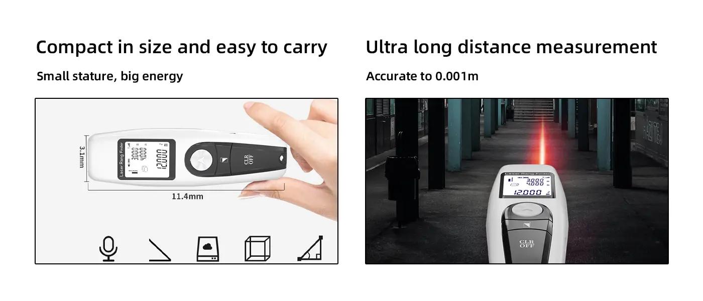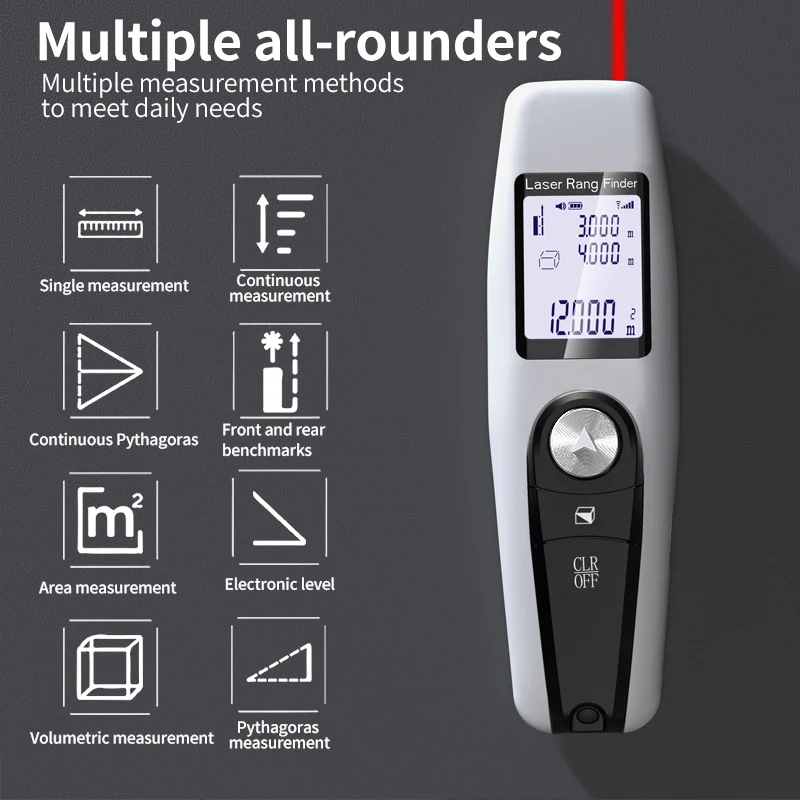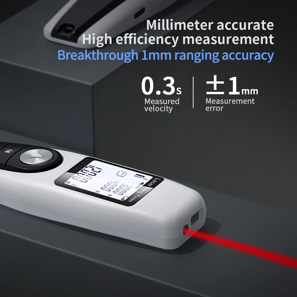 This compact yet powerful laser measurer combines millimeter-level accuracy with a lightweight, portable design. With 11 practical functions and a simple two-button interface, it supports various measurement modes such as area, volume, angle, and continuous Pythagorean calculation. Designed for everyday scenarios like home layout planning or furniture fitting, it features a USB fast charging port, long battery life (up to 3500 measurements), and a measuring range of up to 40 meters. Ideal for diverse applications, from home renovation to industrial use.