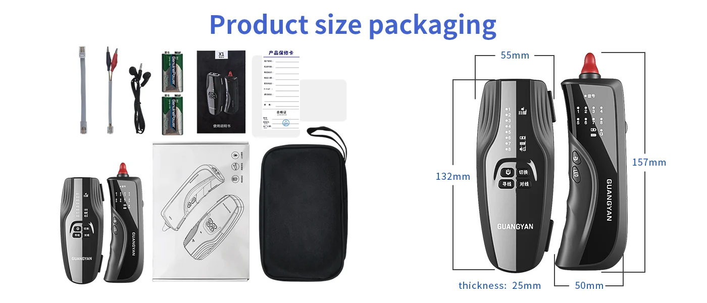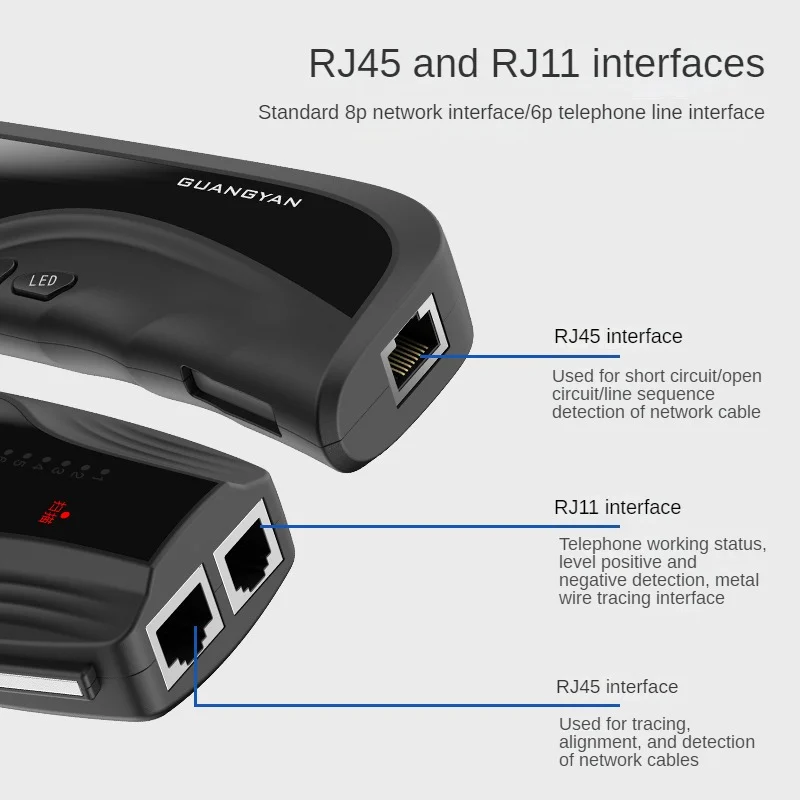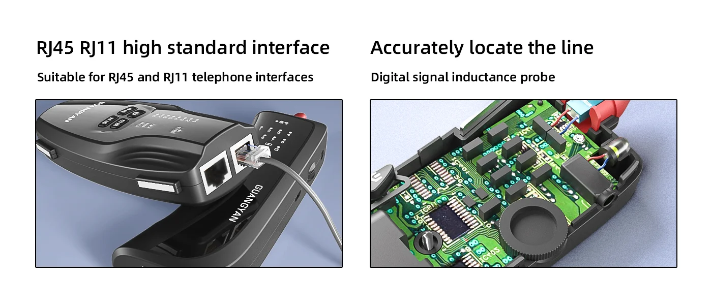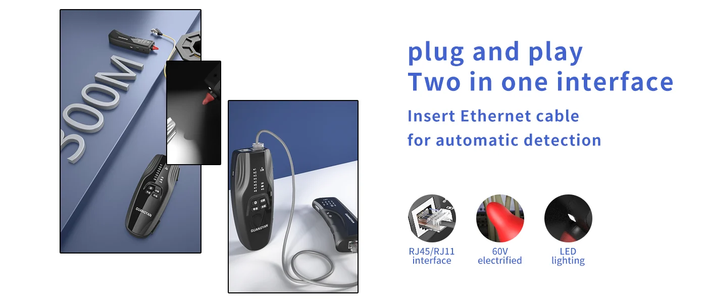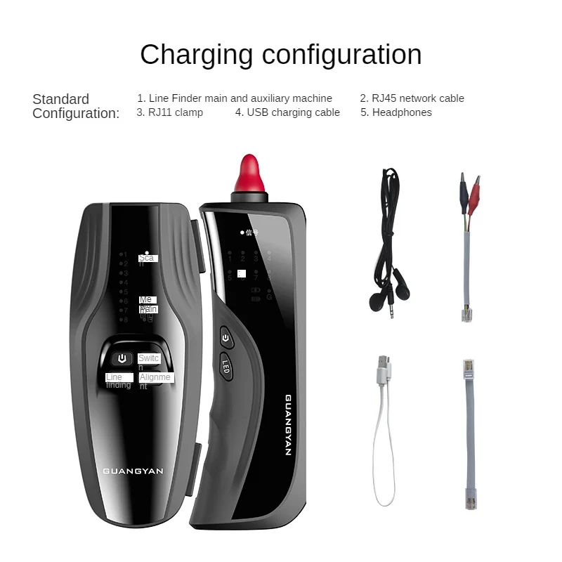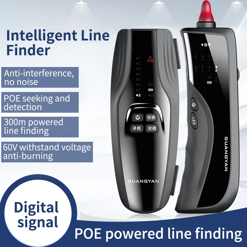 This advanced cable tracker integrates analog/digital signal tracking, fast line finding, and PoE detection, supporting RJ11/RJ45 and alligator clip interfaces. It features LED lighting for dark environments, magnetic adsorption for convenient storage, and adjustable sensitivity for accurate detection over distances up to 300 meters. Ideal for network maintenance and weak current system testing.