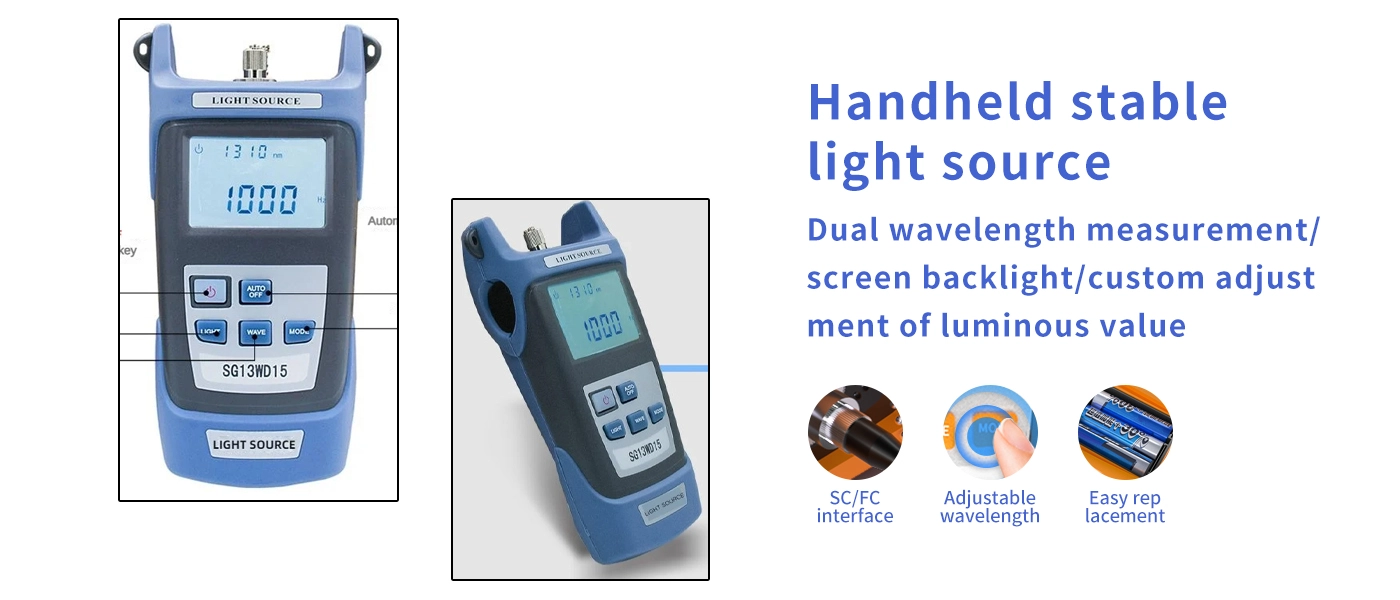 A professional dual-wavelength light source (1310nm and 1550nm) designed for fiber engineering. Provides stable optical output, ideal for testing fiber continuity, loss, and performance. Equipped with intelligent power management and easy-to-use interface, this light source ensures accurate results in various field conditions.